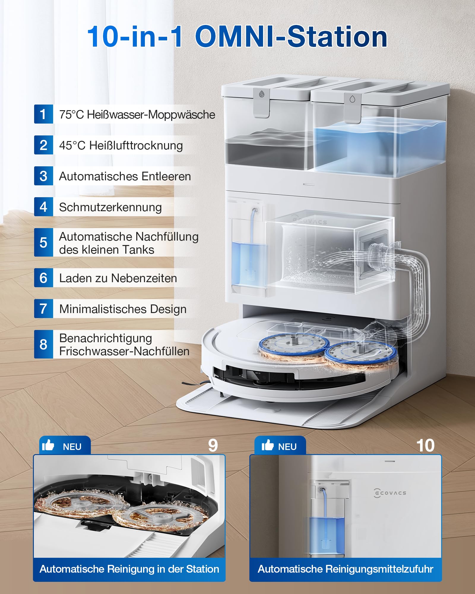 Die OMNI-Station bietet zusätzlichen Komfort mit automatischer Entleerung, 75 °C Warmwasser-Moppwäsche, 45 °C Heißlufttrocknung und automatischer Zugabe von Reinigungslösung. Mit dem YIKO Voice Assistant lässt sich der Roboter zudem bequem per Sprache steuern und in den Alltag integrieren.